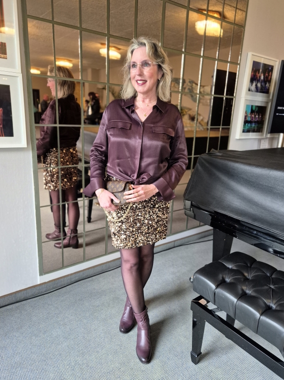 Liebe Ari, eigentlich wollte ich gerade zu deinem schönen Wittenberg-Besuch etwas schreiben, da stoße ich auf diesen neuen Beitrag von Dir mit diesem phantastischen Paillettenrock, der Dich soo wunderbar kleidet. Dazu diese schicke satinierte Bluse. Klasse, wie sowohl der Rock als auch die Bluse in diesem Look gleich stark zur Geltung kommen, zwei Hingucker zugleich. Da hast Du wieder einmal eine super Kombi zusammengestellt. Dass Du Dich vor einem Spiegel hast fotografieren lassen, so dass man Dich ( und Du Dich selbstverständlich auch!) zugleich in zwei Positionen sehen kann kann, gefiel mir schon bei den Bildern aus dem Olsen-Shop in Lübeck. Die Tasche ist natürlich die absolute Spitze. Aber meine Meinung dazu kennst Du ja! Stimmt, mit der kurzen goldenen Kette ist sie top geeignet für festliche Anlässe.