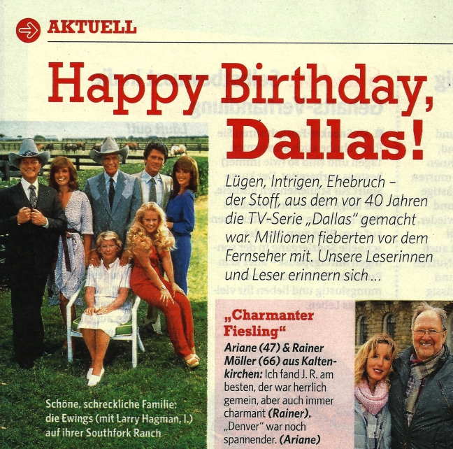 Vor 40 Jahren startete die bekannte TV-Serie Dallas. Jeden Dienstag Abend wurde damals Dallas in der ARD ausgestrahlt. Bild der Frau befragte uns dazu. Der kleine Artikel erschien vor einer …